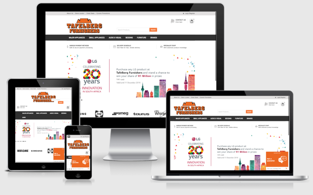 Tafelberg Furnishers, the largest independent furniture retailer in the Western Cape with over 9 branches, approached iMod Digital to create an eCommerce shopping platform for them.They had no solution in place and had never attempted to understand the online space, nevermind actually attempt to build a solution.iMod Digital guided them through the entire process by educating them, understanding their requirements and following through with a brilliantly built SEO-friendly, eCommerce website.The site has been live since the 14th of August 2016 and has brought in sales to the tune of over 7 figures within the first 3 months, with the site going live at 6pm, and a sale happening by the time the team had got to work the next morning.The directors are thrilled and understandably so.